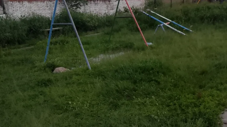 Plaza saludable invadida por la maleza y juegos deteriorados