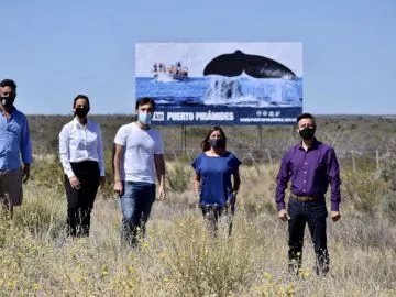 "Hoy, junto con la Secretaria de Turismo, el diputado nacional @NachoTorresCH y la concejal @maruedominguez inauguramos el nuevo cartel de Puerto Pirámides en la Ruta Nacional 3. #PuertoPirámides #PenínsulaValdes #AperturaResponsable", escribió Gandón, de Juntos por el Cambio y jefe comunal desde el 2019.