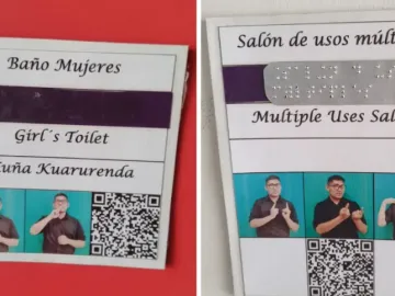 Además de braille, lengua de señas, inglés y quechua se puede observar en el ingreso a cada aula, oficinas, baños y otros lugares del establecimiento.