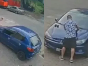 En el video se puede ver al hombre caminando por la calle con una chomba blanca con detalles azules y una bermuda negra. En pocos segundos se acerca a un vehículo, saca un objeto -que sería una lija- y comienza a rayar el capó.