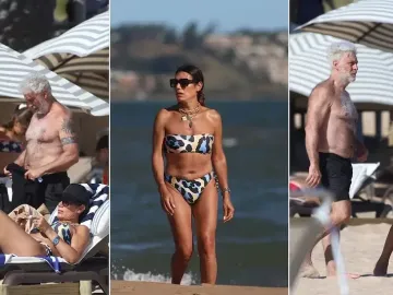 Por su parte, su hija, sentada en otra reposera, se inclinó hacia su hermano Paul con una sonrisa espontánea, mientras él, concentrado, parecía observar algo en la distancia con la curiosidad propia de su edad. Pablo, de pie, con el torso al descubierto y su característico cabello blanco, se acomodaba la ropa tras un chapuzón en el agua. La escena rebosó armonía: cada uno disfrutando del momento a su manera, juntos pero en libertad.